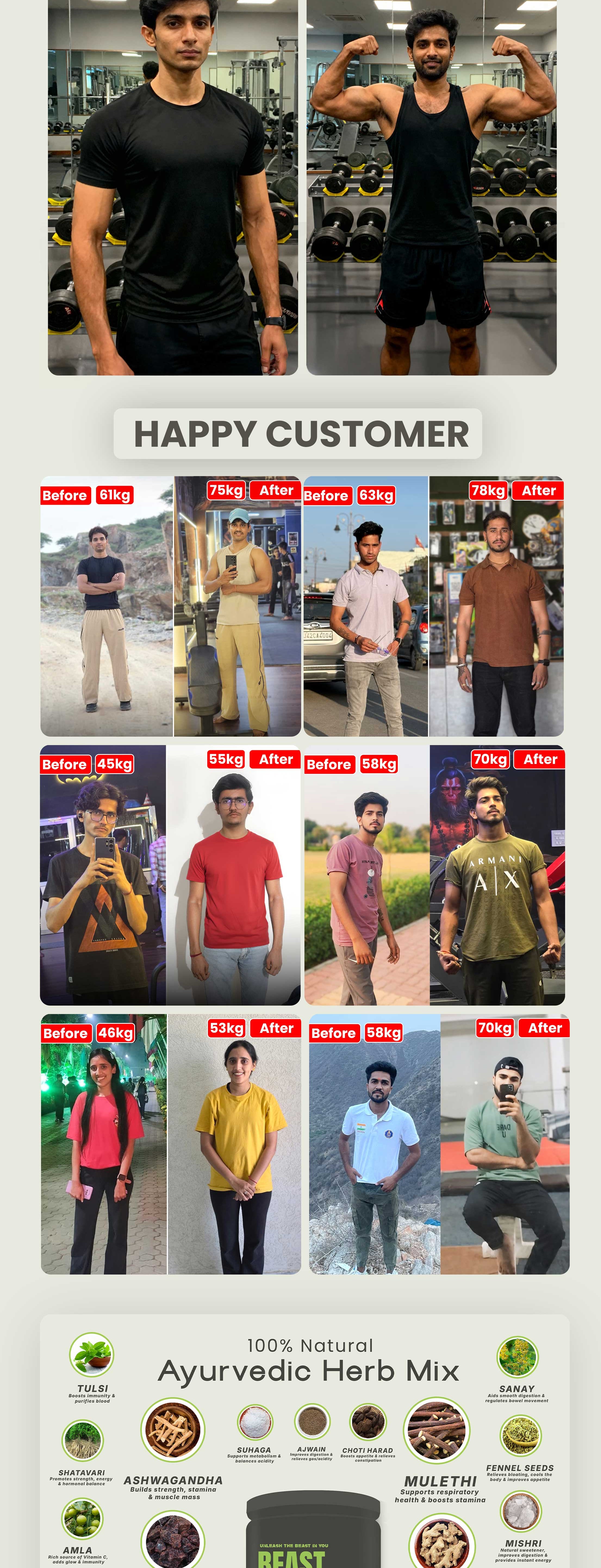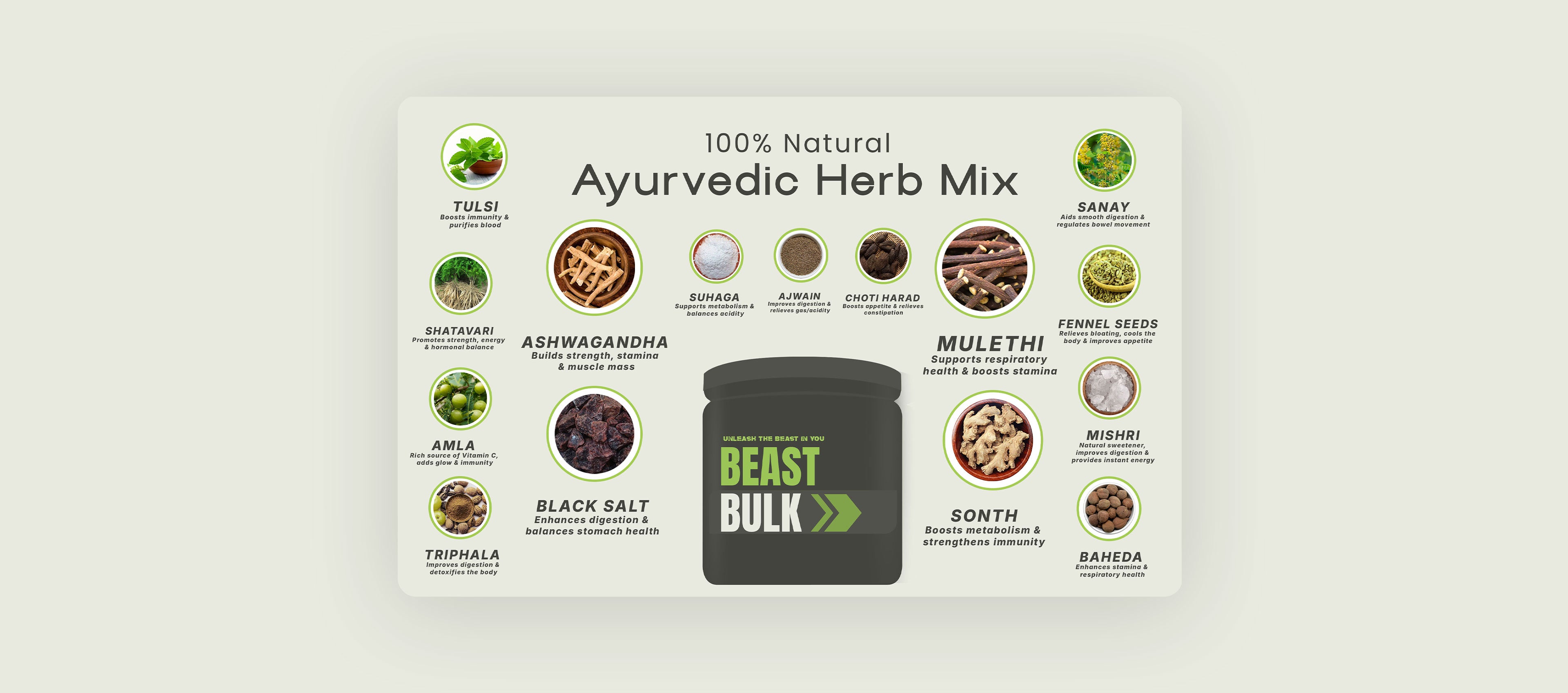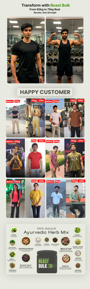Beast Bulk is a traditional Ayurvedic blend of 15 pure herbs like Ashwagandha, Shatavari, and Triphala — crafted to support balanced nourishment, appetite, and digestion the natural way. It helps the body utilize nutrients better and maintain healthy strength and vitality over time.